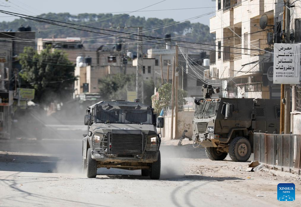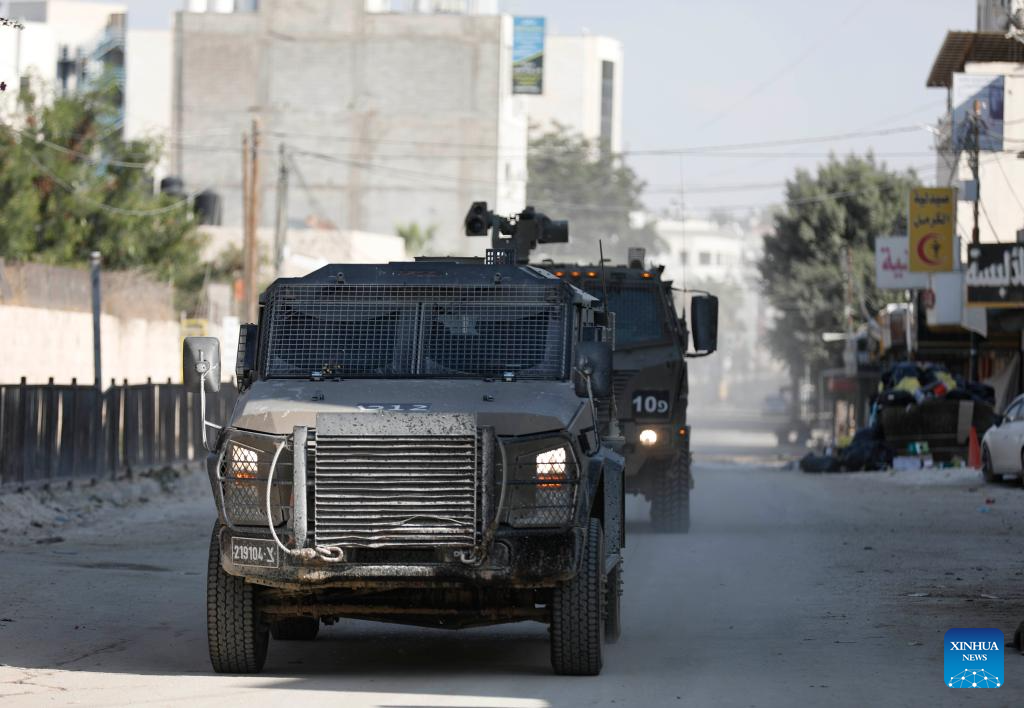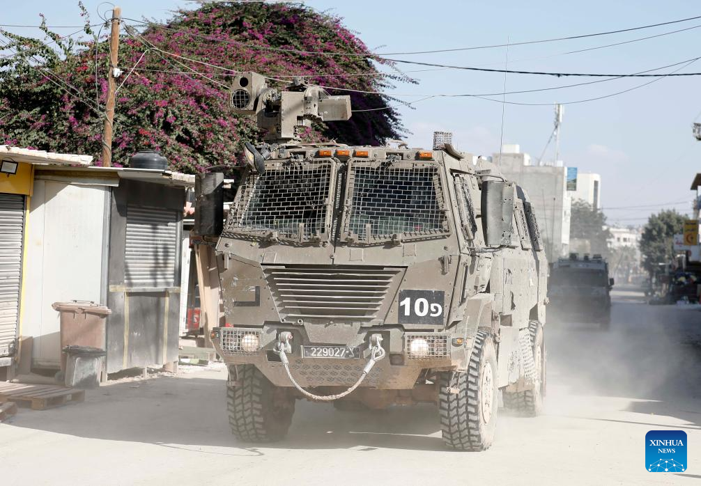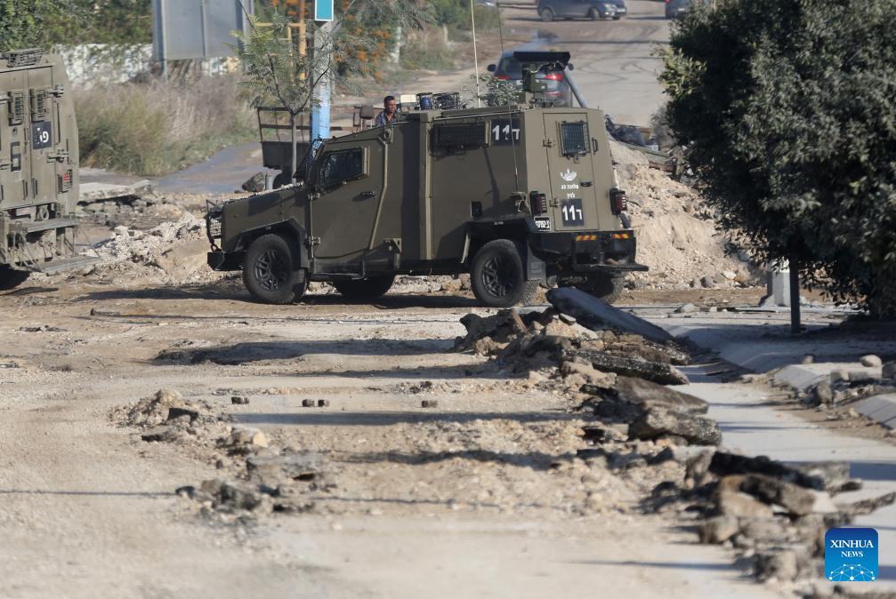 An Israeli military vehicle is seen during an Israeli raid in Jenin, northern West Bank, on Nov. 5, 2024. Four Palestinians were killed in Israeli airstrikes and gunfire in Jenin and Tubas, the Palestinian Health Ministry said Tuesday. (Photo by Nidal Eshtayeh/Xinhua)