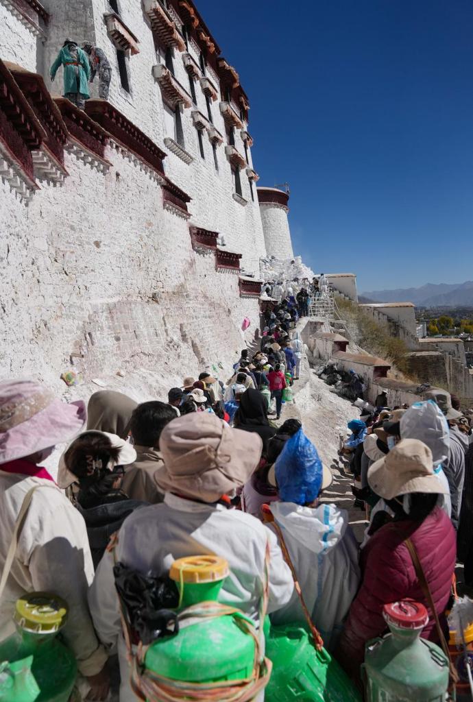 LHASA, Nov. 7 (Xinhua) -- When you think of the iconic Potala Palace in Lhasa, you likely picture its striking red-and-white walls rising boldly against the sky. Rumor has it that these walls are painted with a mixture of milk and sugar, giving the palace a unique "sweet" allure. Intrigued by this legend, I couldn't resist joining the annual repainting event to see for myself.
