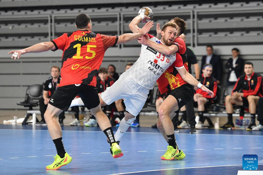 Luka Cindric (C) of Croatia is challenged by Quinten Colman and Raphael Kotters (R) of Belgium during the qualification match between Croatia and Belgium for the Men's European Handball Championship 2026 in Varazdin, Croatia, on Nov. 7, 2024. (Photo by Vjeran Zganec Rogulja/PIXSELL via Xinhua)