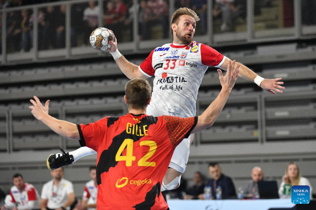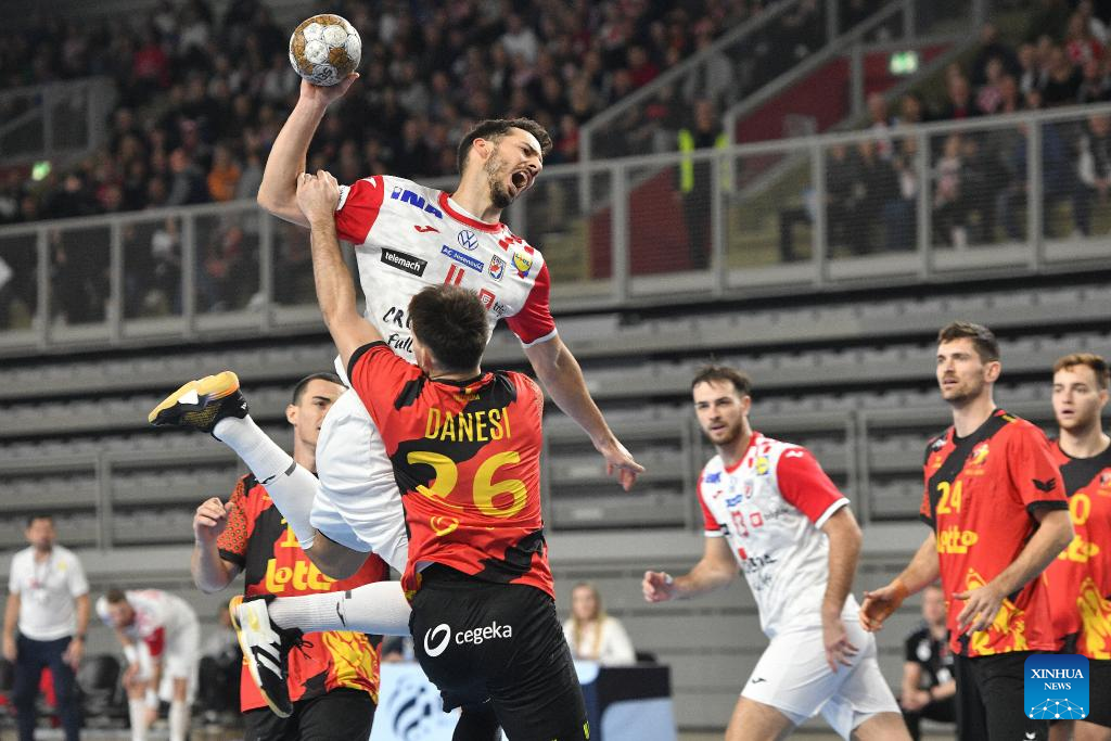 Sebastian Danesi (L) of Belgium shoots during the qualification match between Croatia and Belgium for the Men's European Handball Championship 2026 in Varazdin, Croatia, on Nov. 7, 2024. (Photo by Vjeran Zganec Rogulja/PIXSELL via Xinhua)