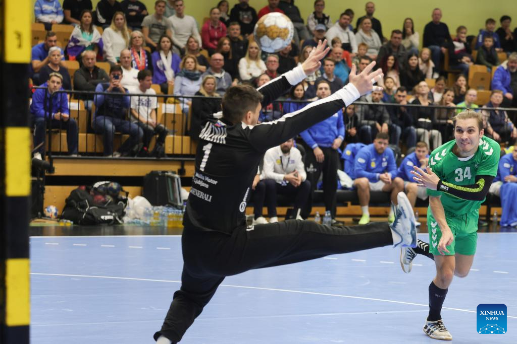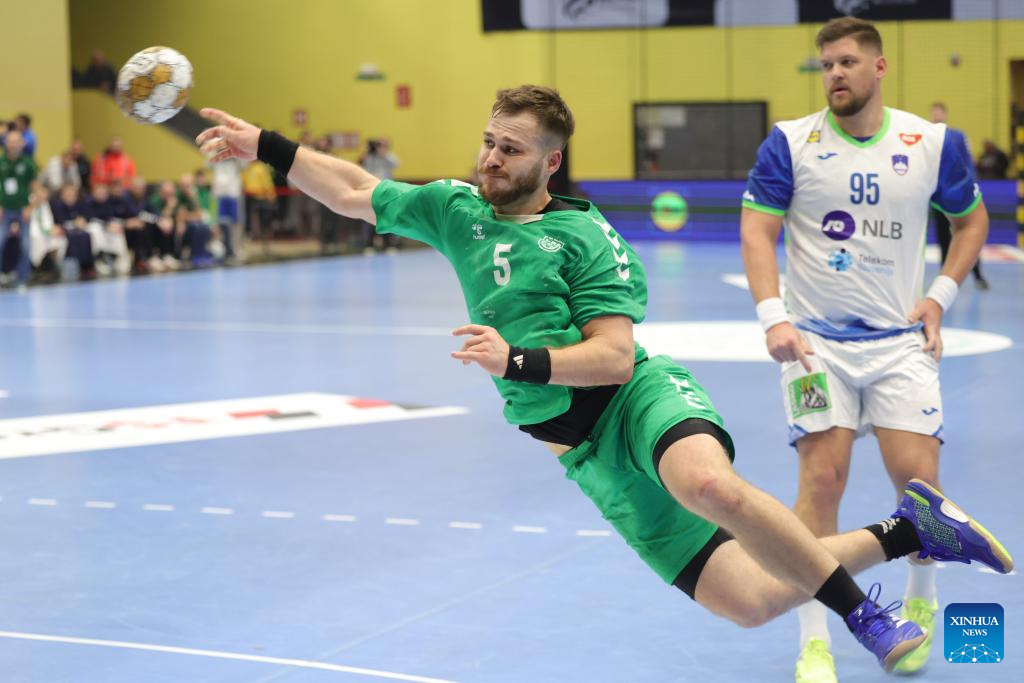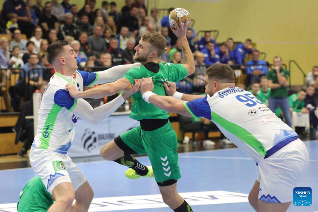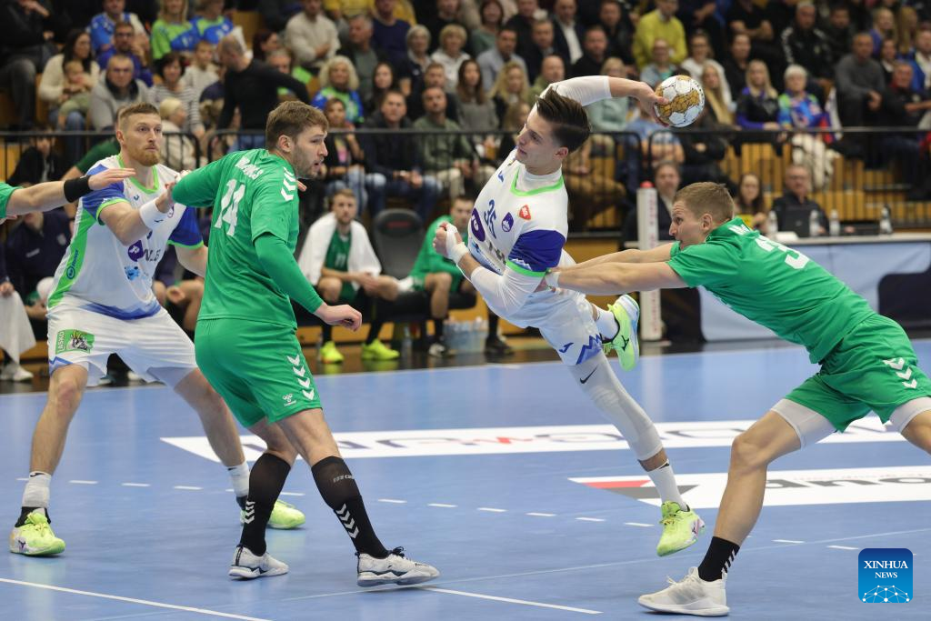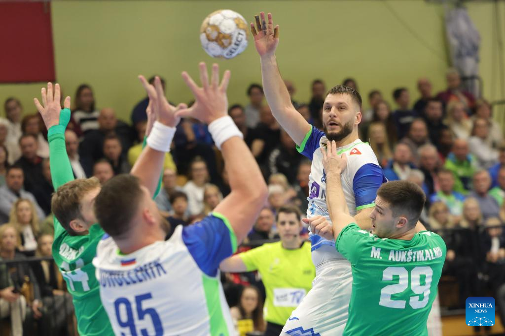 Mykolas Lapiniauskas (R) of Lithuania shoots at the goal during the qualification match between Slovenia and Lithuania for the Men's European Handball Championship 2026, in Velenje, Slovenia, Nov. 7, 2024. (Photo by Zeljko Stevanic/Xinhua)