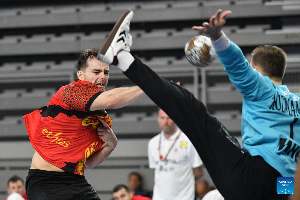 Zvonimir Srna (top) of Croatia shoots against Sebastian Danesi of Belgium during the qualification match between Croatia and Belgium for the Men's European Handball Championship 2026 in Varazdin, Croatia, on Nov. 7, 2024. (Photo by Vjeran Zganec Rogulja/PIXSELL via Xinhua)