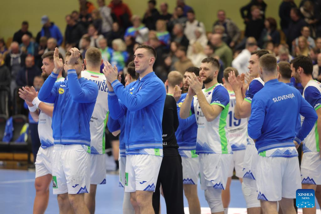 Players of Slovenia celebrate victory after the qualification match between Slovenia and Lithuania for the Men's European Handball Championship 2026, in Velenje, Slovenia, Nov. 7, 2024. (Photo by Zeljko Stevanic/Xinhua)