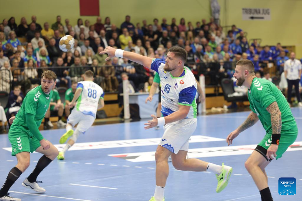 Nik Henigman (L) and Matic Suholeznik (R) of Slovenia compete during the qualification match between Slovenia and Lithuania for the Men's European Handball Championship 2026, in Velenje, Slovenia, Nov. 7, 2024. (Photo by Zeljko Stevanic/Xinhua)