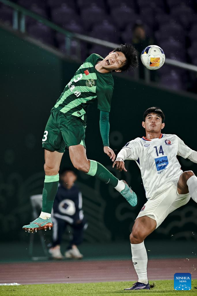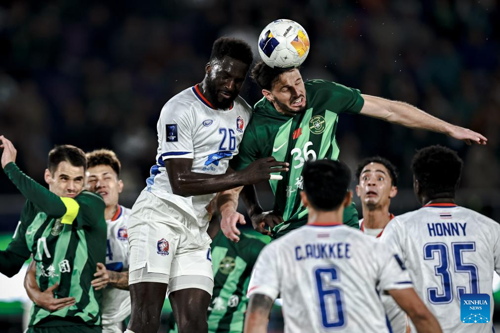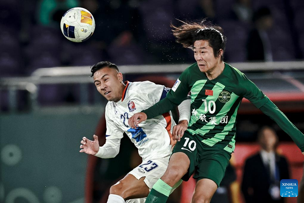 Wang Yang (L) of Zhejiang FC vies for a header during the AFC Champions League Two group F match between China's Zhejiang FC and Thailand's Port FC in Hangzhou, east China's Zhejiang Province, Nov. 7, 2024. (Xinhua/Jiang Han)