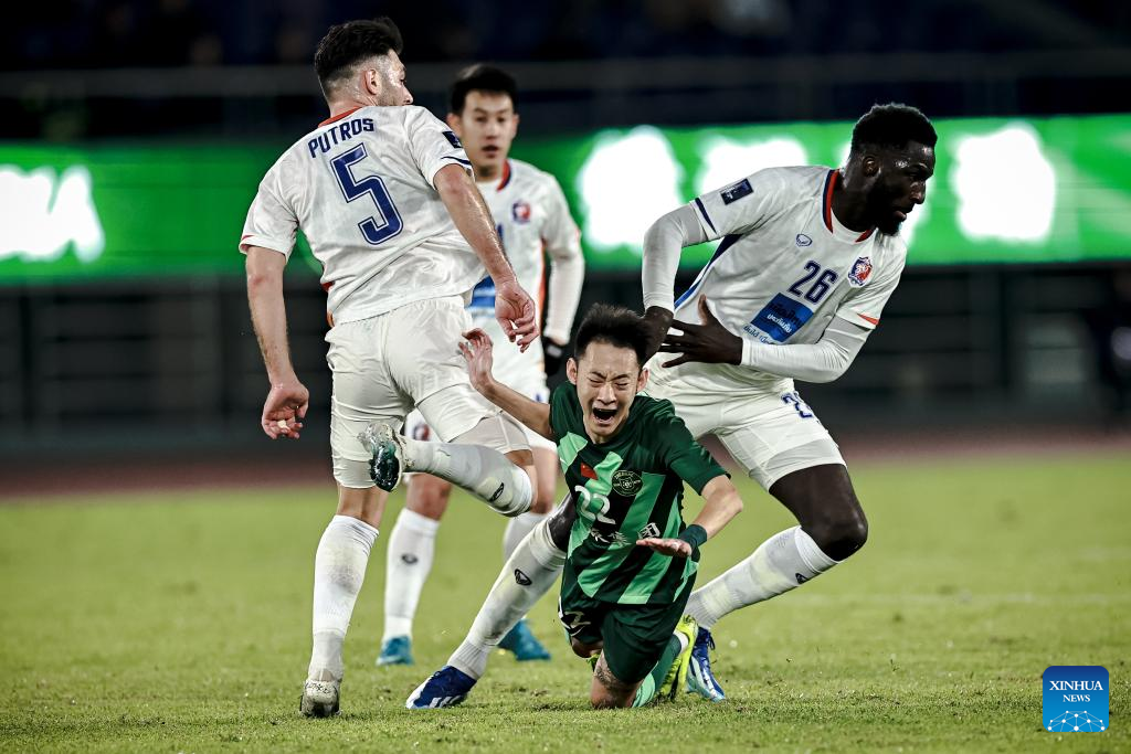 Cheng Jin (Bottom) of Zhejiang FC falls down during the AFC Champions League Two group F match between China's Zhejiang FC and Thailand's Port FC in Hangzhou, east China's Zhejiang Province, Nov. 7, 2024. (Xinhua/Jiang Han)
