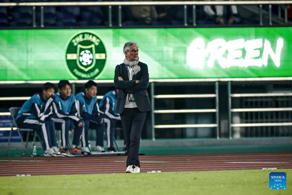 Zhejiang FC's head coach Jordi Vinyals Martori reacts during the AFC Champions League Two group F match between China's Zhejiang FC and Thailand's Port FC in Hangzhou, east China's Zhejiang Province, Nov. 7, 2024. (Xinhua/Jiang Han)