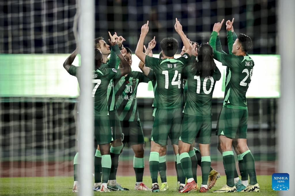 Players of Zhejiang FC gesture after scoring during the AFC Champions League Two group F match between China's Zhejiang FC and Thailand's Port FC in Hangzhou, east China's Zhejiang Province, Nov. 7, 2024. (Xinhua/Jiang Han)