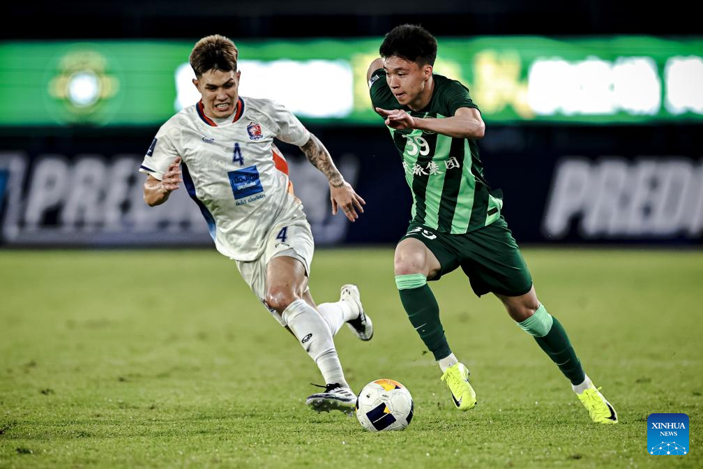 Wang Yudong (R) of Zhejiang FC breaks through during the AFC Champions League Two group F match between China's Zhejiang FC and Thailand's Port FC in Hangzhou, east China's Zhejiang Province, Nov. 7, 2024. (Xinhua/Jiang Han)