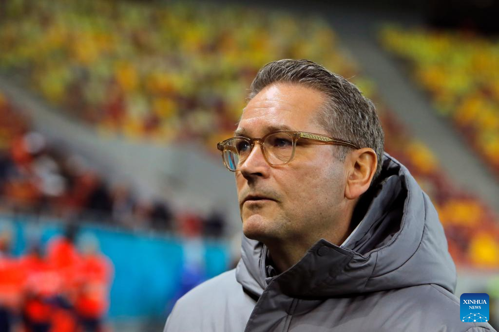 Midtjylland's coach Thomas Thomasberg looks on before a UEFA Europa League match between FCSB and Midtjylland in Bucharest, Romania, Nov. 7, 2024. (Photo by Cristian Cristel/Xinhua)