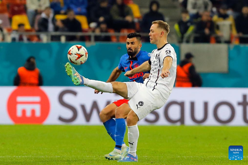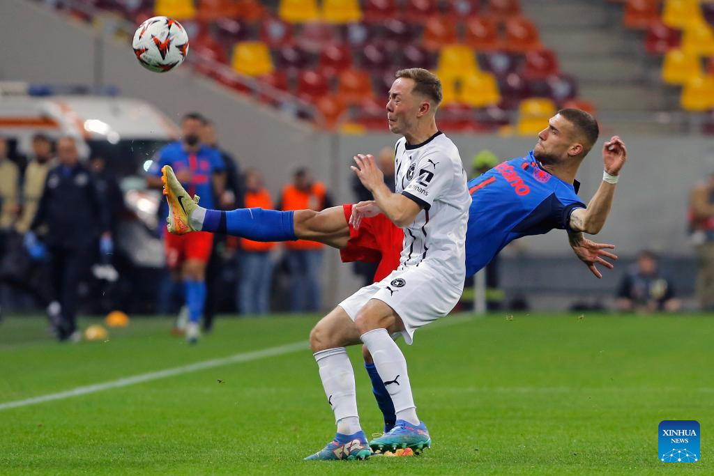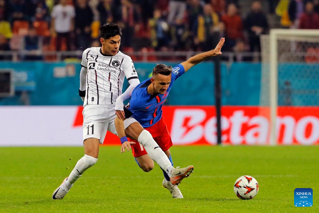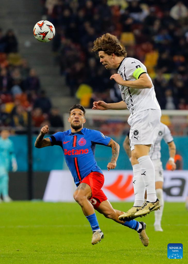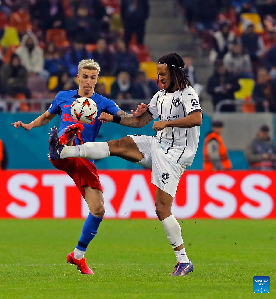 FCSB's Daniel Birligea (R) vies with Midtjylland's Joel Andersson during a UEFA Europa League match between FCSB and Midtjylland in Bucharest, Romania, Nov. 7, 2024. (Photo by Cristian Cristel/Xinhua)