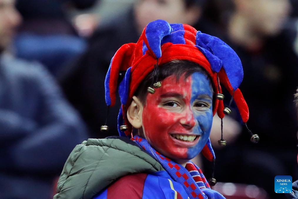 A child with his face painted in FCSB's colours looks on during a UEFA Europa League match between FCSB and Midtjylland in Bucharest, Romania, Nov. 7, 2024. (Photo by Cristian Cristel/Xinhua)