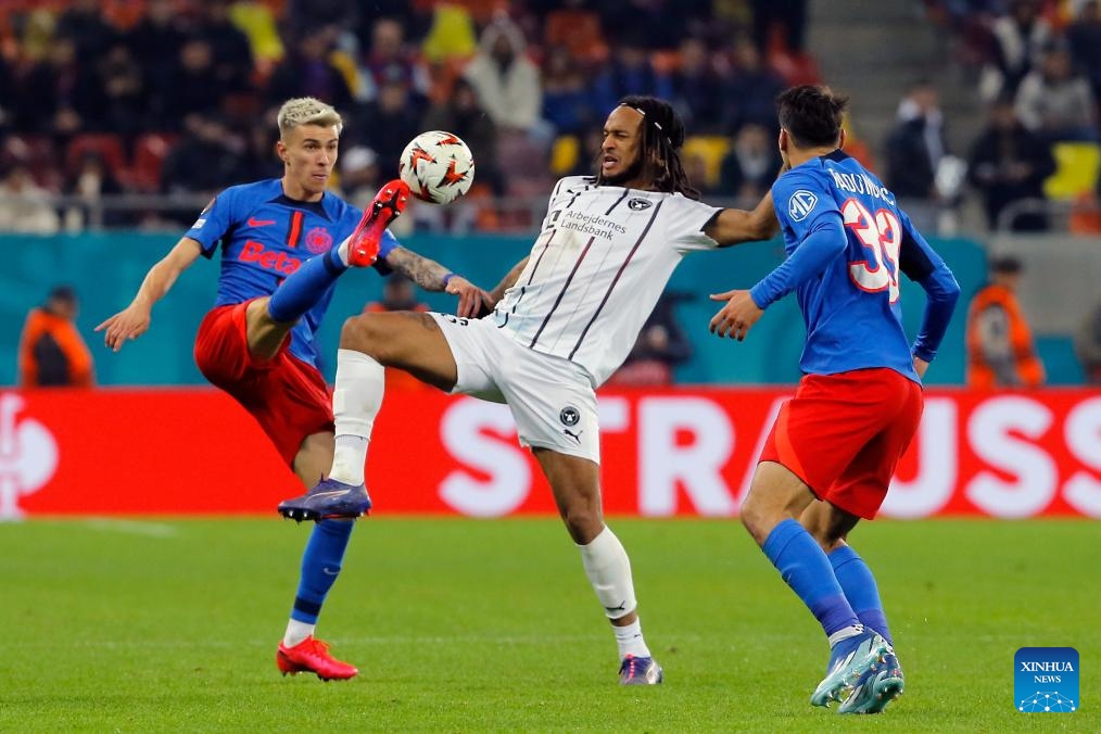 FCSB's Octavian Popescu (L) and Risto Radunovic (R) vie with Midtjylland's Kevin Mbabu during a UEFA Europa League match between FCSB and Midtjylland in Bucharest, Romania, Nov. 7, 2024. (Photo by Cristian Cristel/Xinhua)