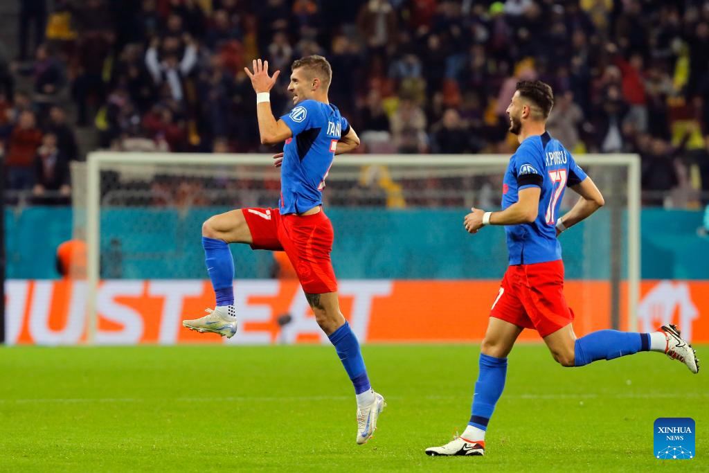 FCSB's Florin Tanase (L) celebrates scoring during a UEFA Europa League match between FCSB and Midtjylland in Bucharest, Romania, Nov. 7, 2024. (Photo by Cristian Cristel/Xinhua)