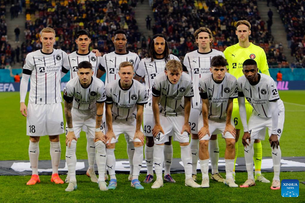 Midtjylland's players line up before a UEFA Europa League match between FCSB and Midtjylland in Bucharest, Romania, Nov. 7, 2024. (Photo by Cristian Cristel/Xinhua)