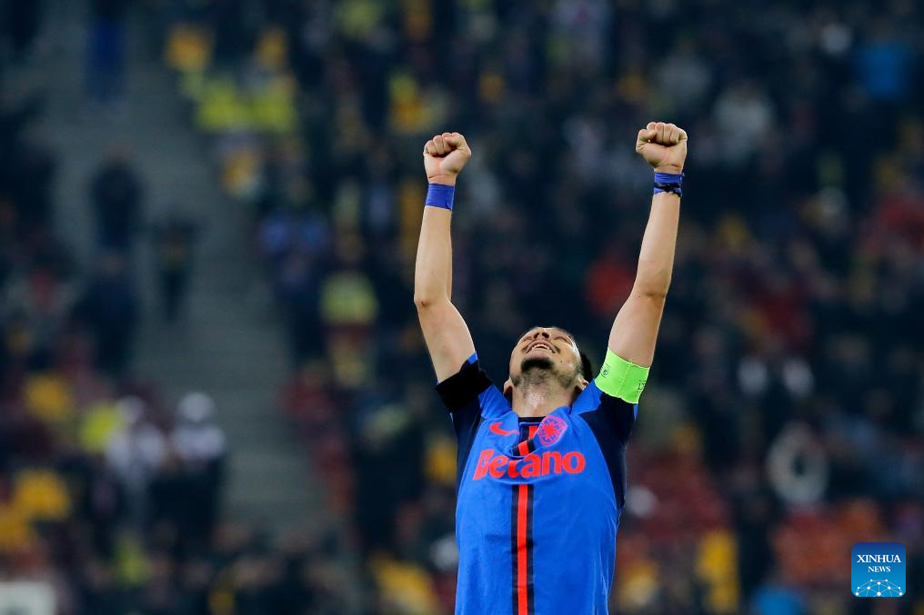 FCSB's Adrian Sut celebrates after a UEFA Europa League match between FCSB and Midtjylland in Bucharest, Romania, Nov. 7, 2024. (Photo by Cristian Cristel/Xinhua)