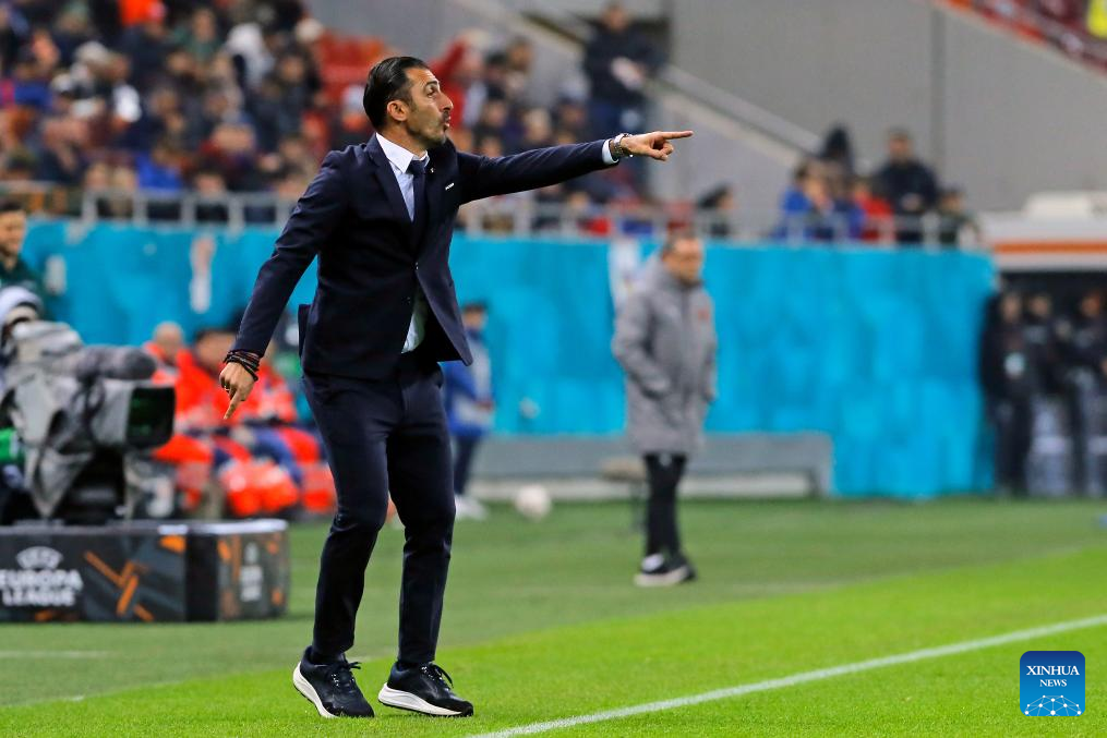 FCSB's coach Elias Charalambous gestures during a UEFA Europa League match between FCSB and Midtjylland in Bucharest, Romania, Nov. 7, 2024. (Photo by Cristian Cristel/Xinhua)