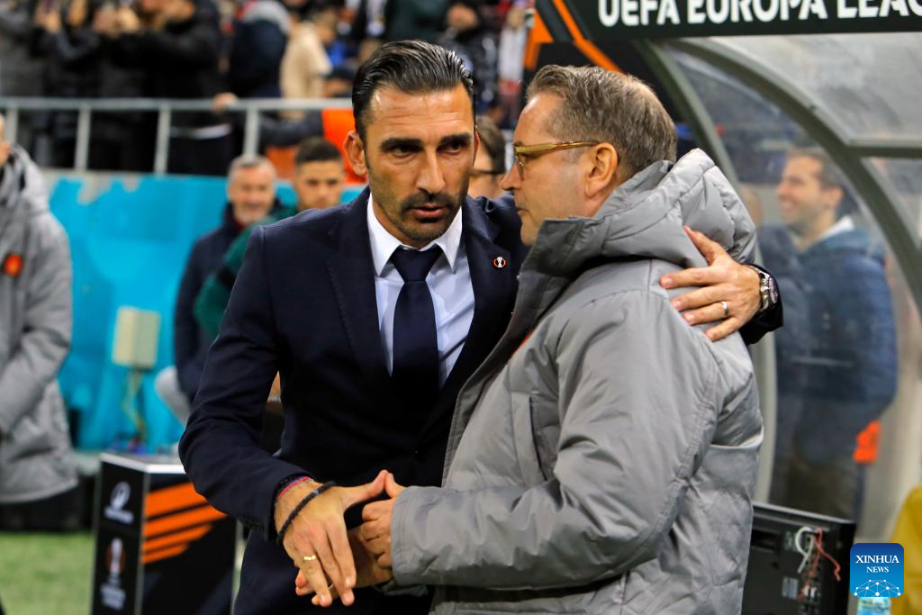 FCSB's coach Elias Charalambous (L) greets Midtjylland's coach Thomas Thomasberg before a UEFA Europa League match between FCSB and Midtjylland in Bucharest, Romania, Nov. 7, 2024. (Photo by Cristian Cristel/Xinhua)