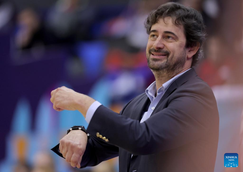 Portugal's head coach Ricardo Vasconcelos gestures during the women's FIBA Eurobasket qualifier basketball match between Serbia and Portugal in Belgrade, Serbia on Nov. 7, 2024. (Photo by Predrag Milosavljevic/Xinhua)
