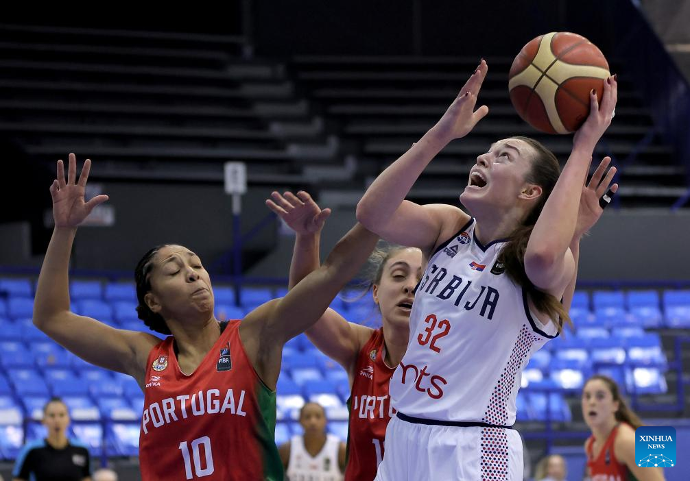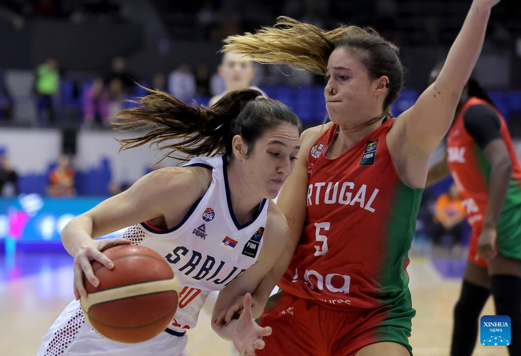 Serbia's Aleksandra Katanic (L) vies with Portugal's Carolina Rodrigues during the women's FIBA Eurobasket qualifier basketball match between Serbia and Portugal in Belgrade, Serbia on Nov. 7, 2024. (Photo by Predrag Milosavljevic/Xinhua)
