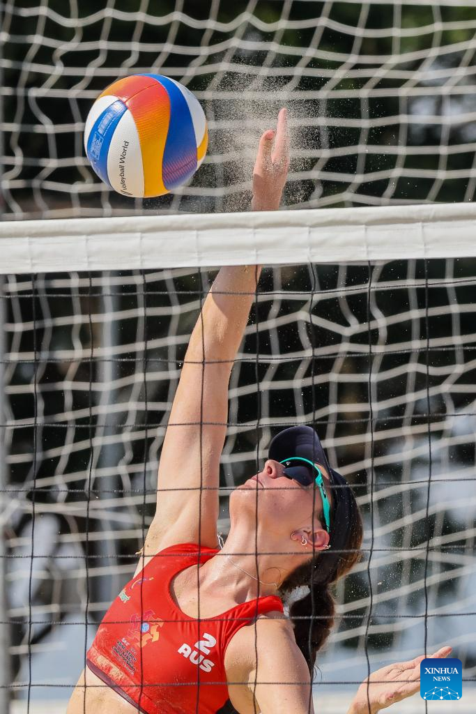 Jasmine Fleming (front) of Australia competes during the women's round 16 match between Alisha Stevens/Cameron Zajer of Australia and Jasmine Fleming/Elizabeth Alchin of Australia at the Asian Volleyball Confederation (AVC) 2024 Asian Senior Beach Volleyball Championships in Laguna Province, the Philippines on Nov. 8, 2024. (Xinhua/Rouelle Umali)