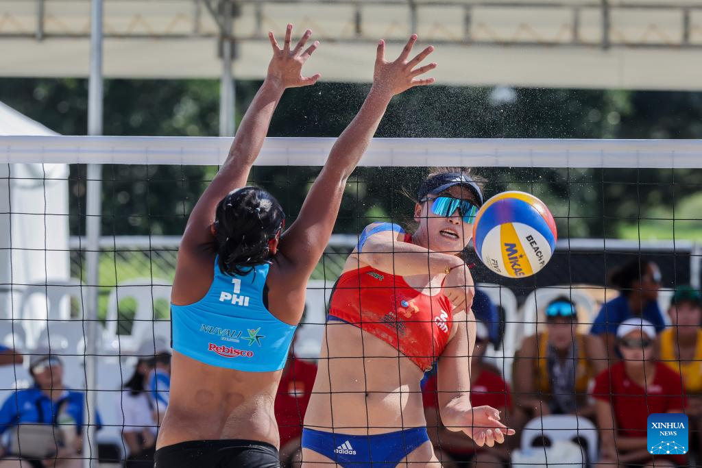 Zeng Jinjin (R) of China competes against Khylem Harl Progella of the Philippines during the women's round 16 match between Xue Chen/Zeng Jinjin of China and Khylem Harl Progella/Sofiah Shanine Pagara of the Philippines at the Asian Volleyball Confederation (AVC) 2024 Asian Senior Beach Volleyball Championships in Laguna Province, the Philippines on Nov. 8, 2024. (Xinhua/Rouelle Umali)