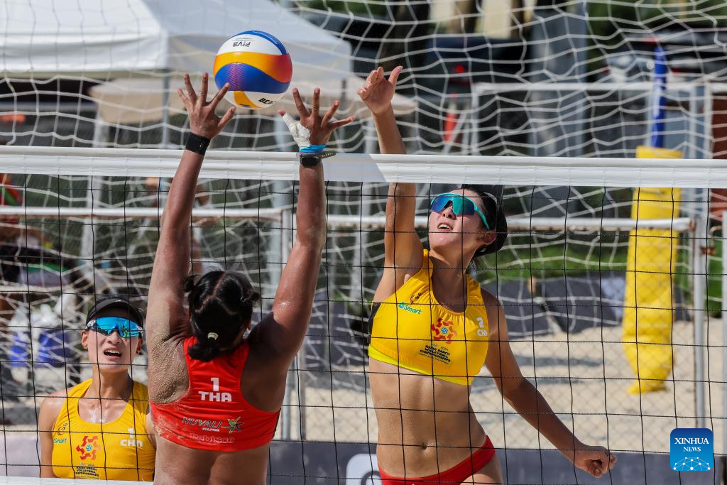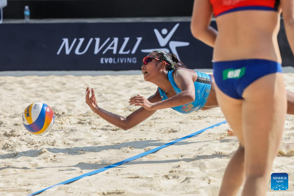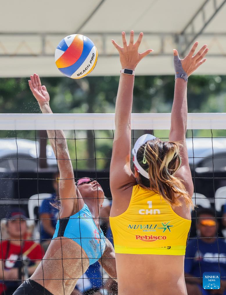 Zhou Mingli (L) of China competes during the women's round 16 match between Yan Xu/Zhou Mingli of China and Rumpaipruet Numwong/Tanarattha Udomchavee of Thailand at the Asian Volleyball Confederation (AVC) 2024 Asian Senior Beach Volleyball Championships in Laguna Province, the Philippines on Nov. 8, 2024. (Xinhua/Rouelle Umali)