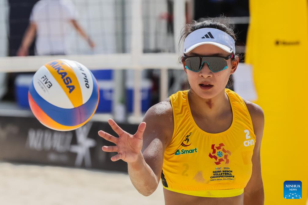 Xia Xinyi of China competes during the women's round 16 match between Wang Jingzhe/Xia Xinyi of China and Genesa Jane Eslapor/Mary Klymince Orillaneda of the Philippines at the Asian Volleyball Confederation (AVC) 2024 Asian Senior Beach Volleyball Championships in Laguna Province, the Philippines on Nov. 8, 2024. The Chinese pair won 2-0. (Xinhua/Rouelle Umali)