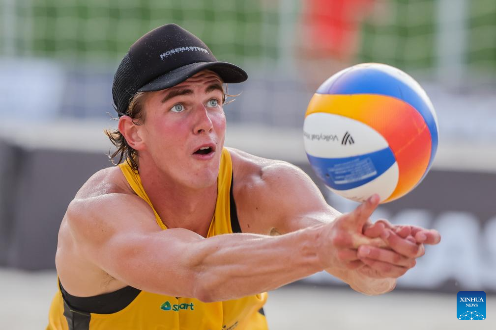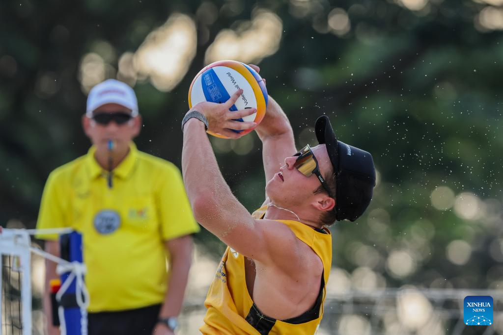 Joshua Howat of Australia competes during the men's round 16 match between Joshua Howat/Luke Ryan of Australia and Kurokawa Kai/Adachi Ryuichi of Japan at the Asian Volleyball Confederation (AVC) 2024 Asian Senior Beach Volleyball Championships in Laguna Province, the Philippines, on Nov. 8, 2024. (Xinhua/Rouelle Umali)