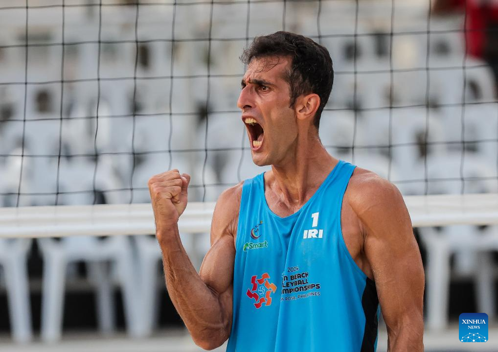 Abbas Pourasgari of Iran reacts during the men's round 16 match between Habib Akbarzadeh Kashani/AmirAli GhalehNovi of Iran and Abbas Pourasgari/Alireza Aghajanighasab of Iran at the Asian Volleyball Confederation (AVC) 2024 Asian Senior Beach Volleyball Championships in Laguna Province, the Philippines, on Nov. 8, 2024. (Xinhua/Rouelle Umali)