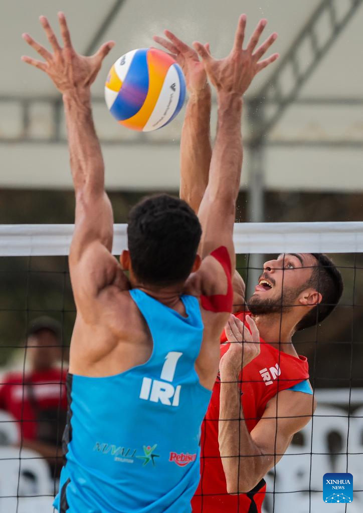 AmirAli GhalehNovi (R) of Iran competes against Abbas Pourasgari of Iran during the men's round 16 match between Habib Akbarzadeh Kashani/AmirAli GhalehNovi of Iran and Abbas Pourasgari/Alireza Aghajanighasab of Iran at the Asian Volleyball Confederation (AVC) 2024 Asian Senior Beach Volleyball Championships in Laguna Province, the Philippines, on Nov. 8, 2024. (Xinhua/Rouelle Umali)