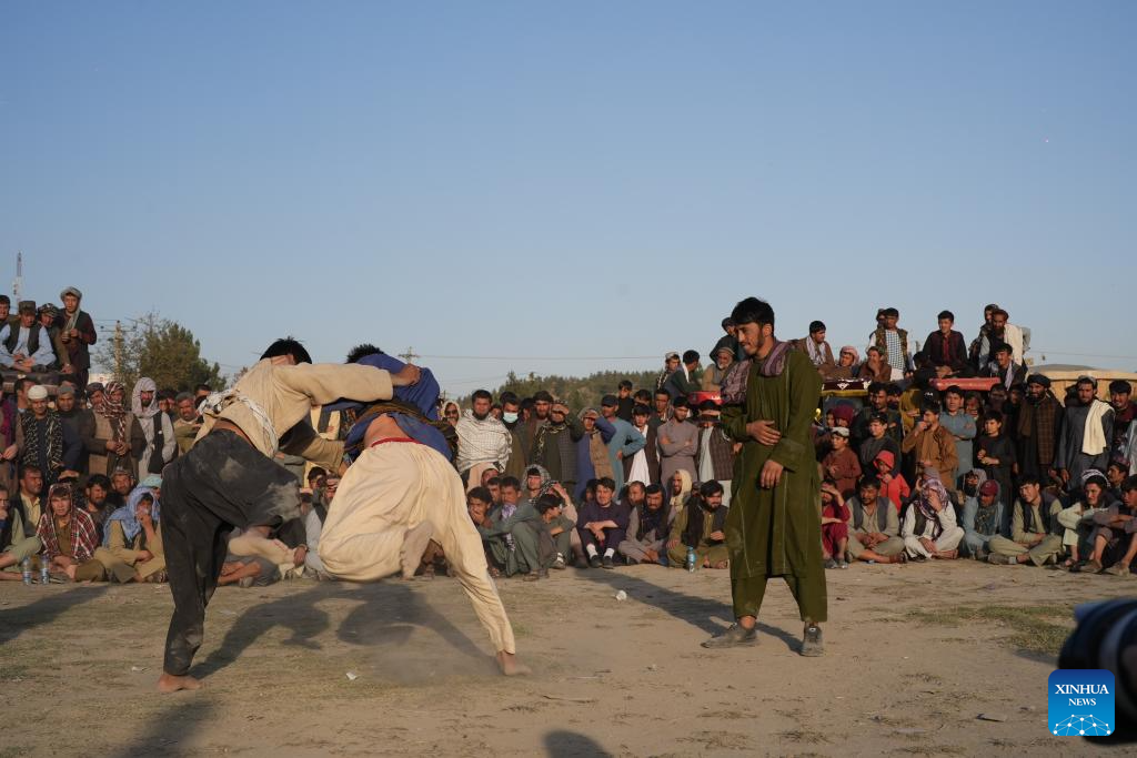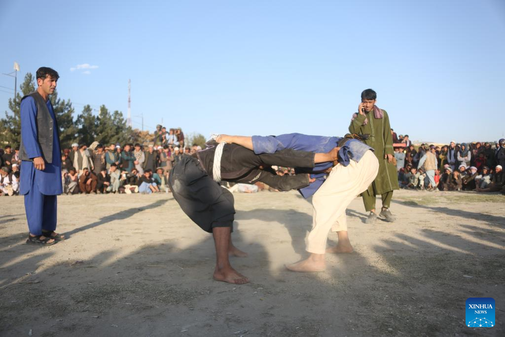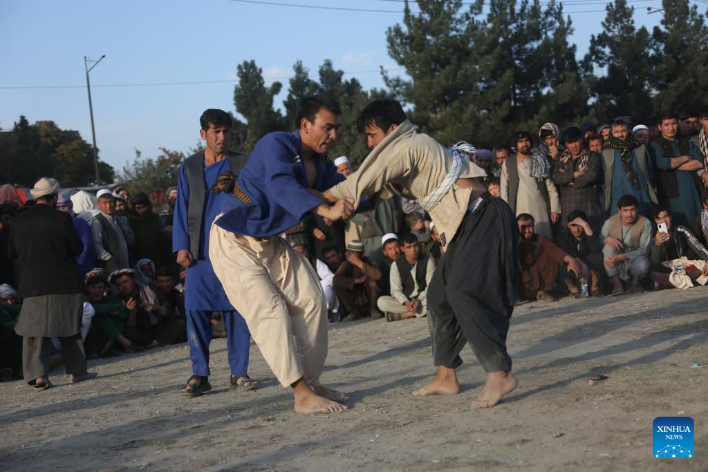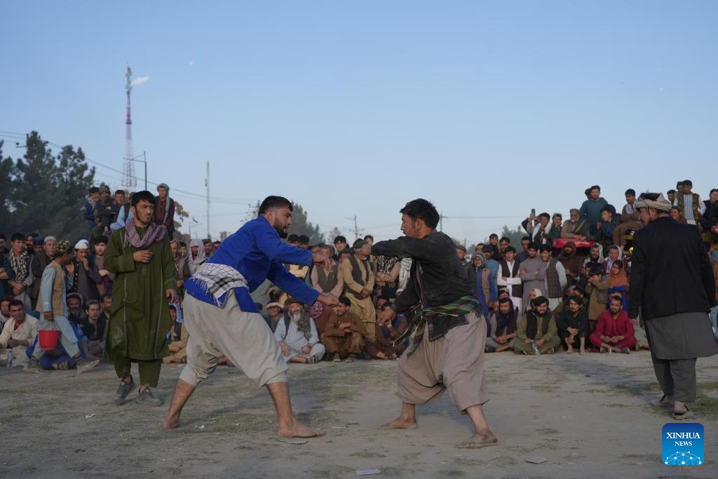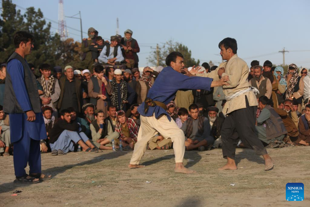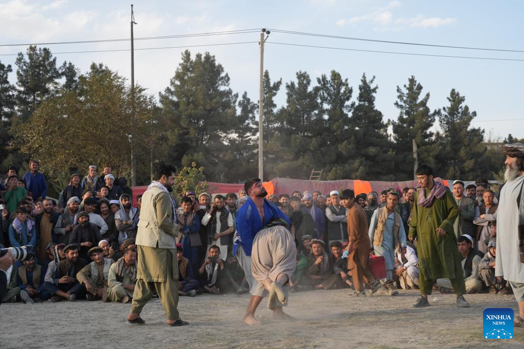 Contestants compete during a wrestling competition in Kabul, capital of Afghanistan, Nov. 8, 2024. Traditional wrestling is popular in the country. Hundreds of people gathered here every Friday to watch the wrestling competition. (Xinhua/Li Ang)