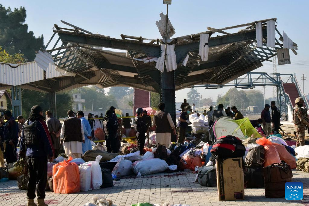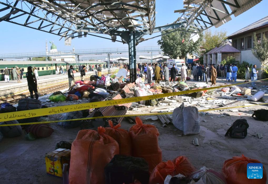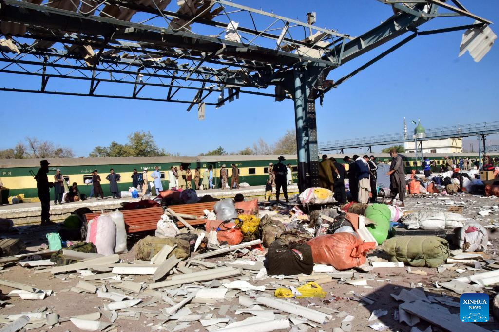 This photo taken on Nov. 9, 2024 shows a view of the railway station after a blast in Quetta city, Pakistan's southwest Balochistan province. At least 20 people were killed and 53 others injured on Saturday morning in a blast at a railway station in Pakistan's southwest Balochistan province, chief executive officer of Pakistan Railways said. (Photo by Asad/Xinhua)