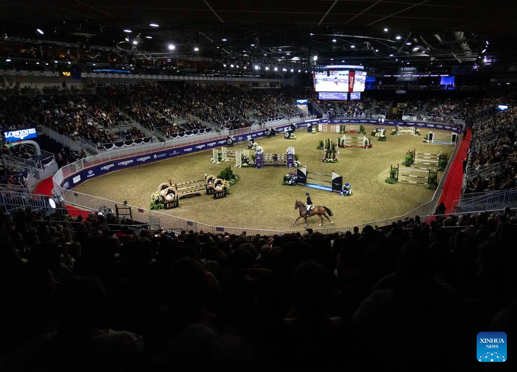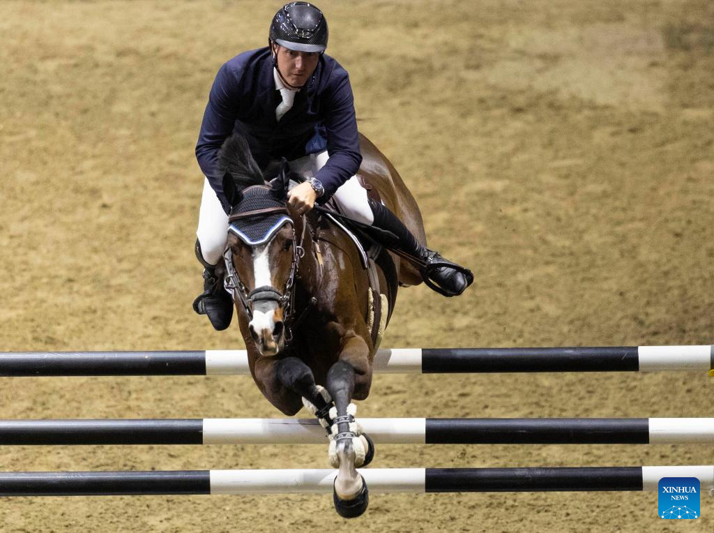 Richard Vogel of Germany rides his horse Phenyo van het Keysersbos during the first round of the FEI Jumping World Cup Toronto 2024 in Toronto, Canada, on Nov. 9, 2024. (Photo by Zou Zheng/Xinhua)