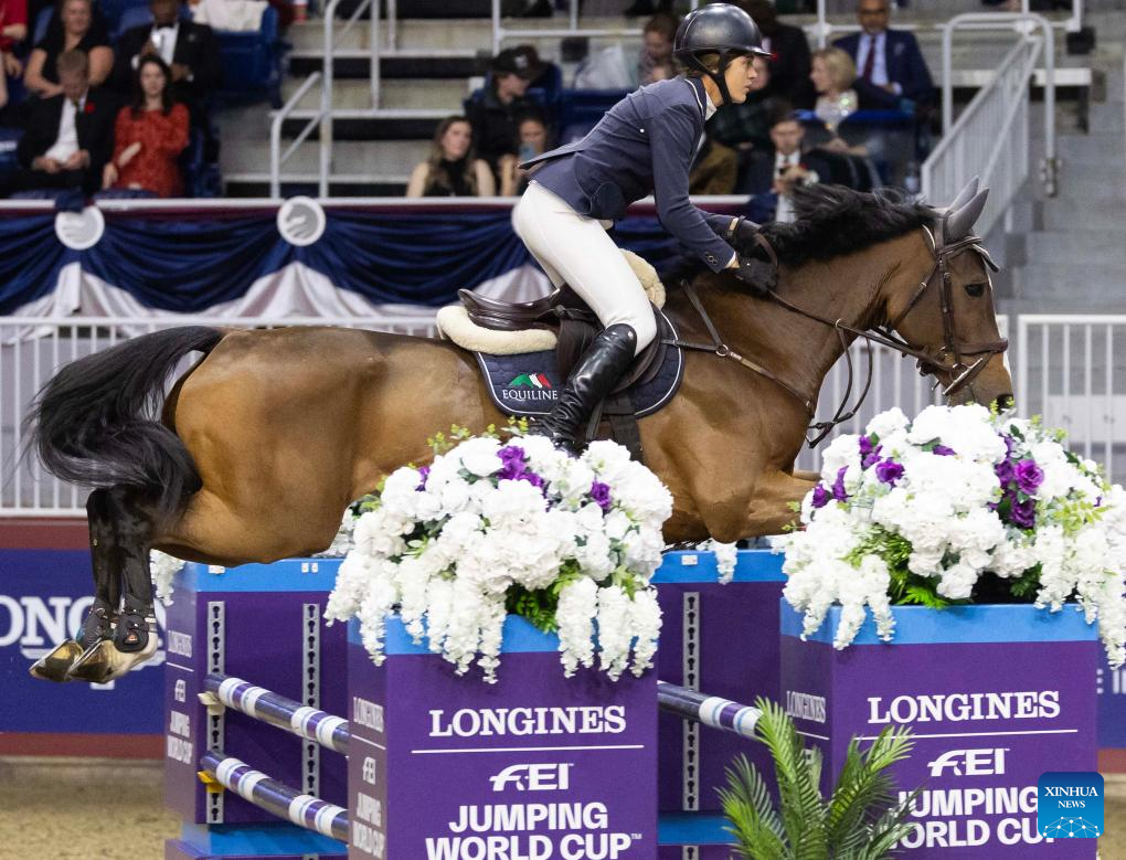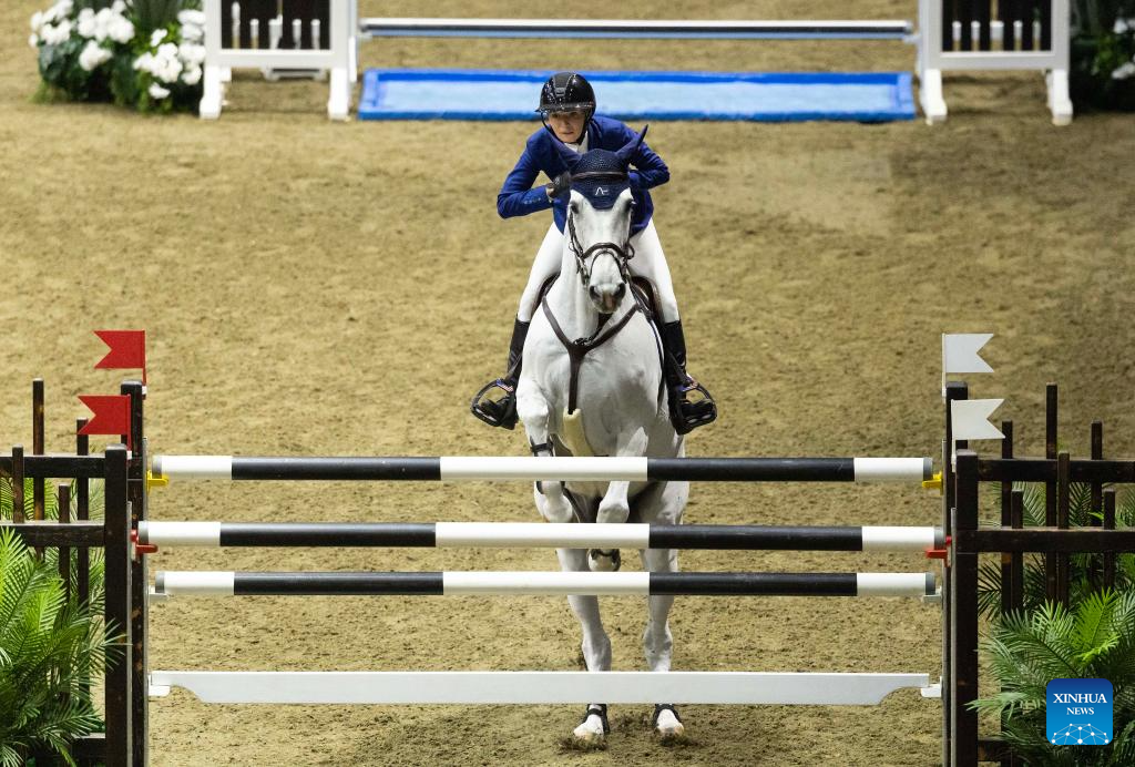 Lillie Keenan of the United States rides her horse Argan de Beliard over an obstacle during the first round of the FEI Jumping World Cup Toronto 2024 in Toronto, Canada, on Nov. 9, 2024. (Photo by Zou Zheng/Xinhua)