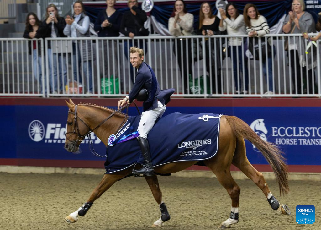 Alex Matz of the United States celebrates victory after the jump-off round of the FEI Jumping World Cup Toronto 2024 in Toronto, Canada, on Nov. 9, 2024. (Photo by Zou Zheng/Xinhua)