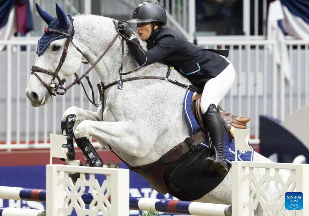 Vanessa Mannix of Canada rides her horse Kingston over an obstacle during the first round of the FEI Jumping World Cup Toronto 2024 in Toronto, Canada, on Nov. 9, 2024. (Photo by Zou Zheng/Xinhua)