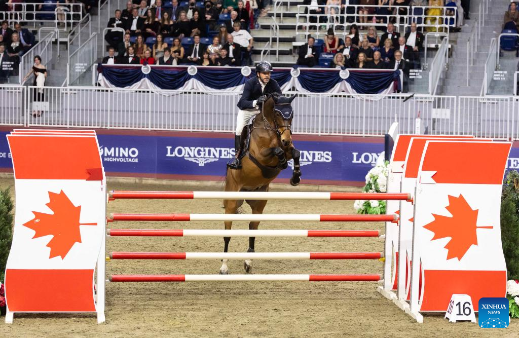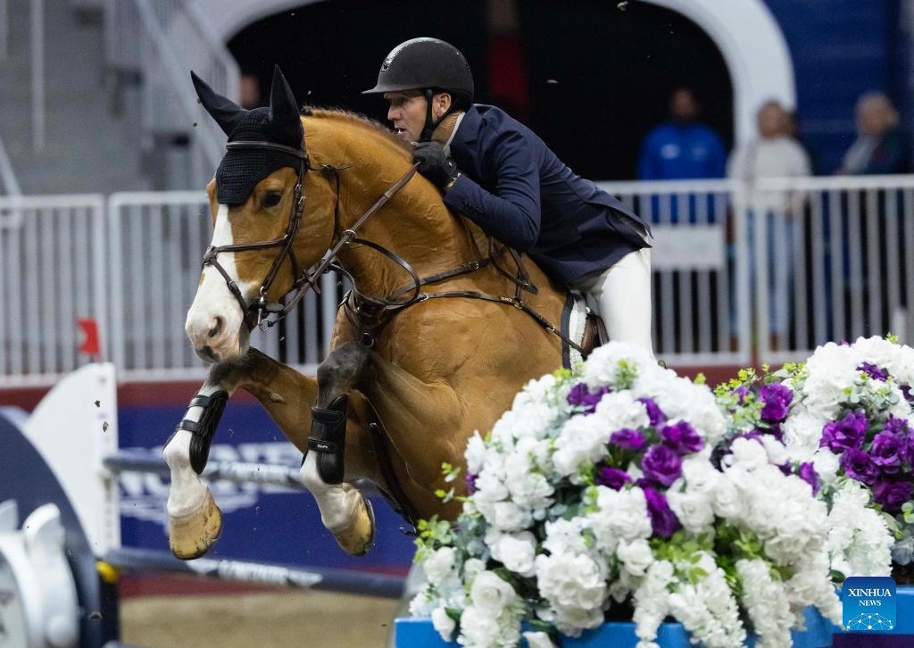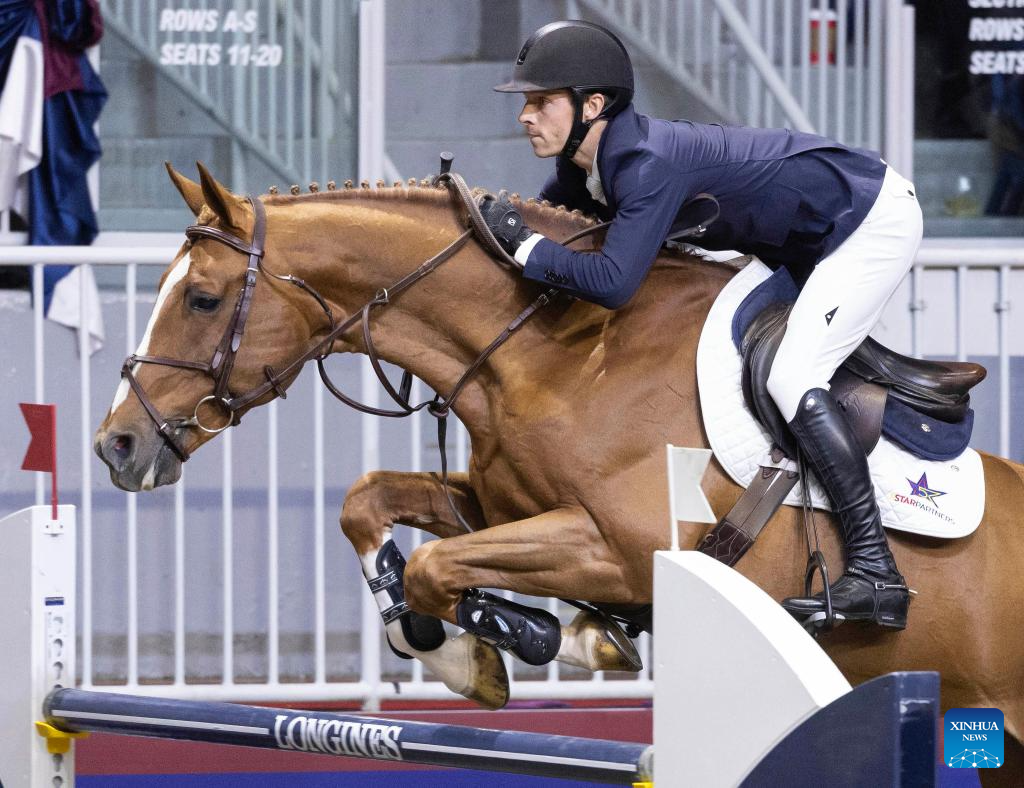Alex Matz of the United States rides his horse Ikigai over an obstacle during the first round of the FEI Jumping World Cup Toronto 2024 in Toronto, Canada, on Nov. 9, 2024. (Photo by Zou Zheng/Xinhua)