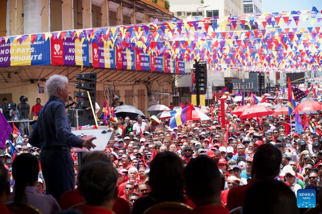 People gather for a rally ahead of the upcoming elections in Port Louis, Mauritius on Nov. 3, 2024. Mauritius will hold its National Assembly elections on Nov. 10. To ensure a smooth and orderly process, the police have announced a ban on alcohol sales from Nov. 9 to 11, covering the day before the elections, the polling day, as well as the day designated for the counting of votes. (Photo by Gonzalo Fanny/Xinhua)
