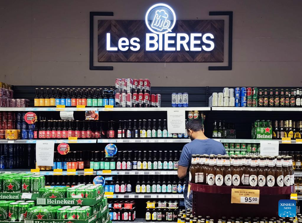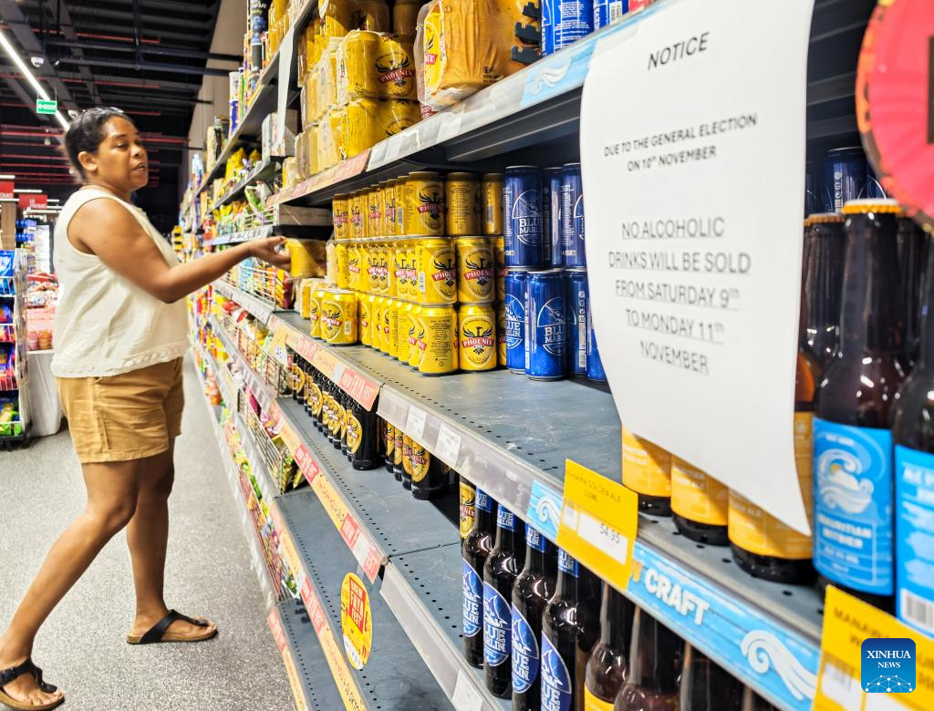 This photo taken with a mobile phone shows a customer buying alcoholic drinks at a supermarket in Moka, Mauritius on Nov. 8, 2024. Mauritius will hold its National Assembly elections on Nov. 10. To ensure a smooth and orderly process, the police have announced a ban on alcohol sales from Nov. 9 to 11, covering the day before the elections, the polling day, as well as the day designated for the counting of votes. (Xinhua/Li Yahui)