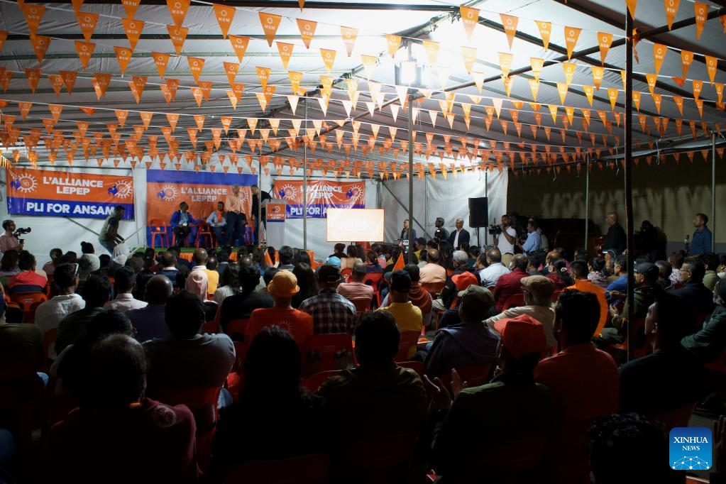 People gather for a rally ahead of the upcoming elections in Moka, Mauritius on Oct. 28, 2024. Mauritius will hold its National Assembly elections on Nov. 10. To ensure a smooth and orderly process, the police have announced a ban on alcohol sales from Nov. 9 to 11, covering the day before the elections, the polling day, as well as the day designated for the counting of votes. (Photo by Gonzalo Fanny/Xinhua)