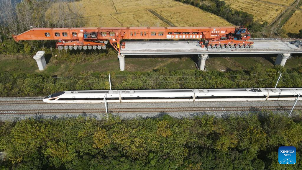 An aerial drone photo taken on Nov. 10, 2024 shows the installation site of box girders of a high-speed railway linking Shanghai, Nanjing of Jiangsu Province and Hefei of Anhui Province in east China. The railway is part of China's high-speed rail network that centers around eight main vertical lines linking the north and south and eight horizontal lines connecting the east and west. (Photo by Sun Chaoqing/Xinhua)