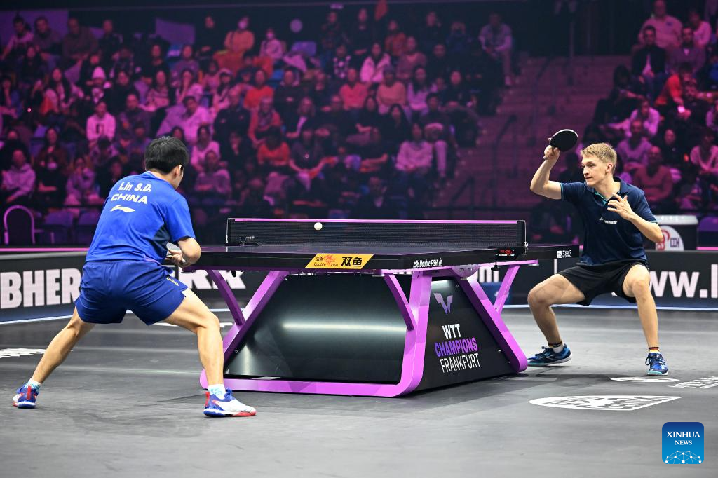 Anton Kallberg (R) of Sweden hits a return during the men's singles final against Lin Shidong of China at World Table Tennis (WTT) Champions Frankfurt 2024 in Frankfurt, Germany, Nov. 10, 2024. (Photo by Ulrich Hufnagel/Xinhua)