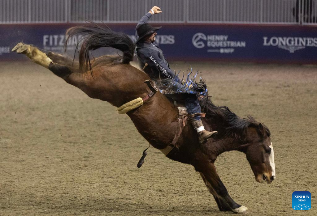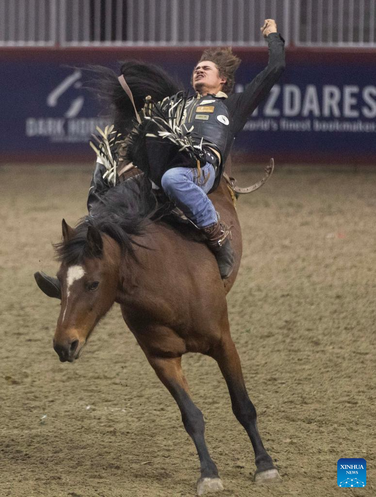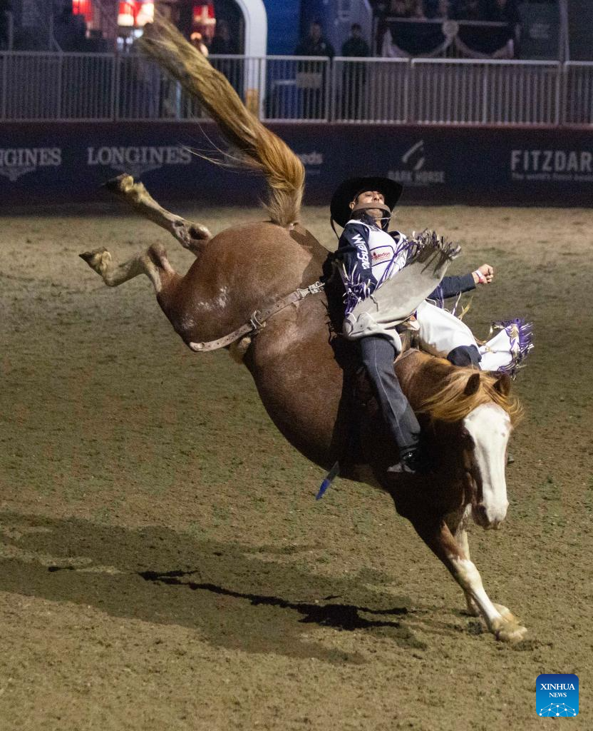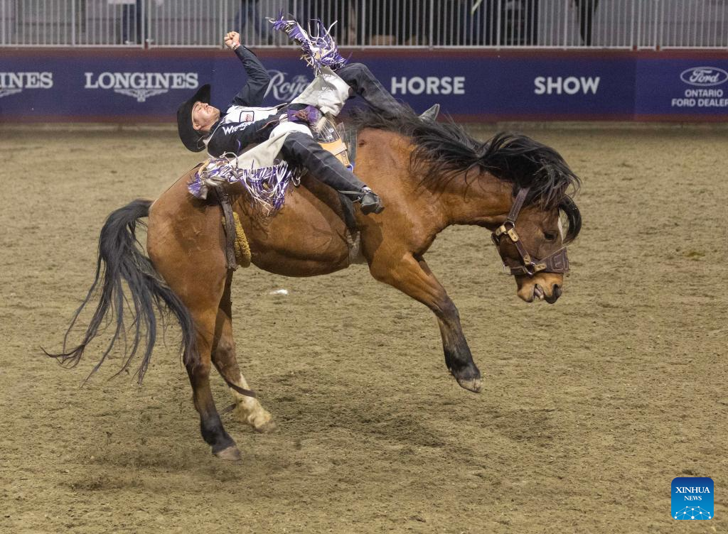 Cowboy Spencer Parker competes during the Bareback Bronc Riding competition of the Royal Rodeo at the 2024 Royal Horse Show in Toronto, Canada, on Nov. 10, 2024. (Photo by Zou Zheng/Xinhua)