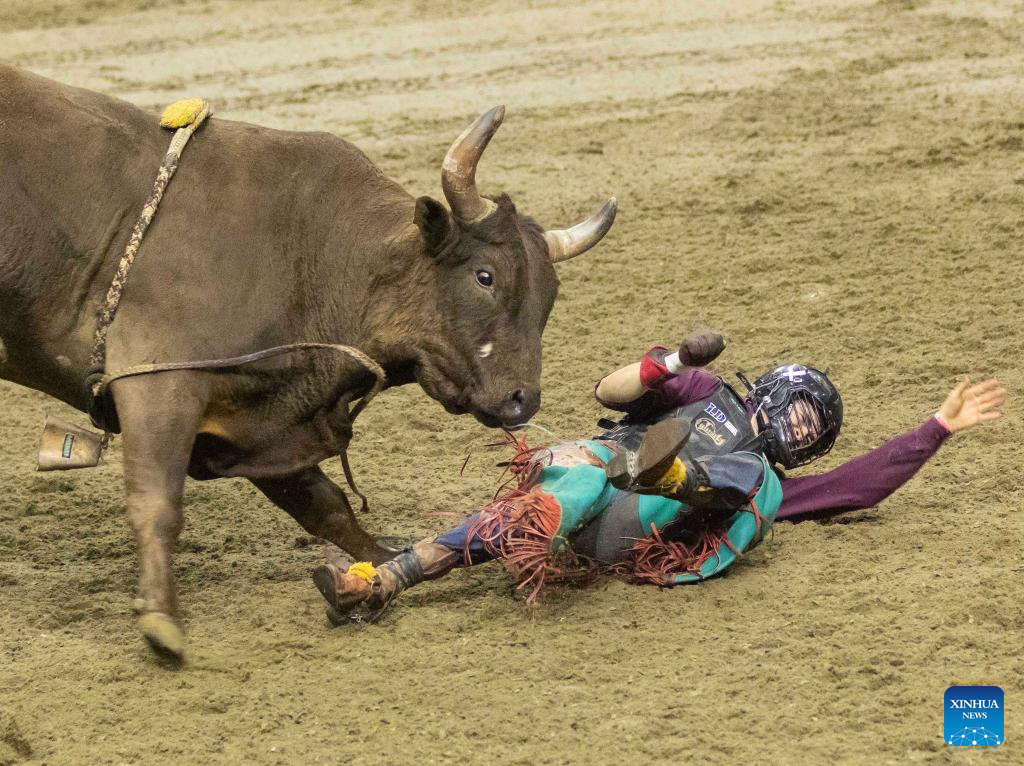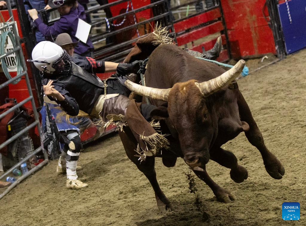Cowboy Austin Illman competes during the Bull Riding competition of the Royal Rodeo at the 2024 Royal Horse Show in Toronto, Canada, on Nov. 10, 2024. (Photo by Zou Zheng/Xinhua)