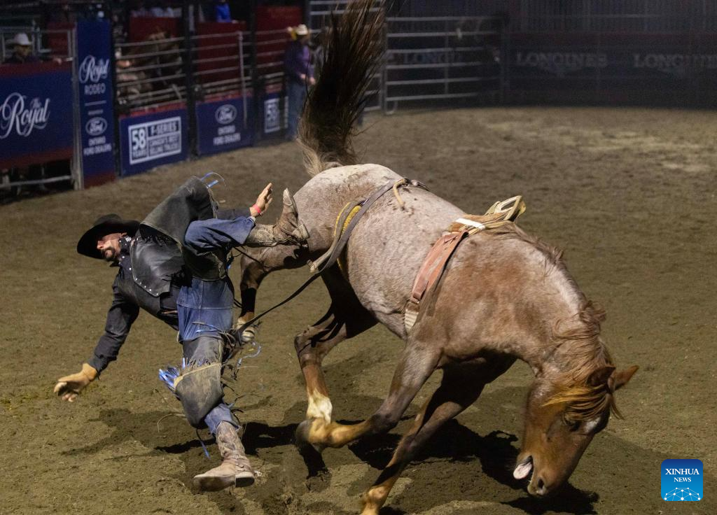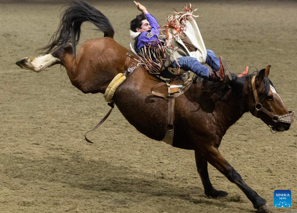 Cowboy Spur Lacasse competes during the Bareback Bronc Riding competition of the Royal Rodeo at the 2024 Royal Horse Show in Toronto, Canada, on Nov. 10, 2024. (Photo by Zou Zheng/Xinhua)