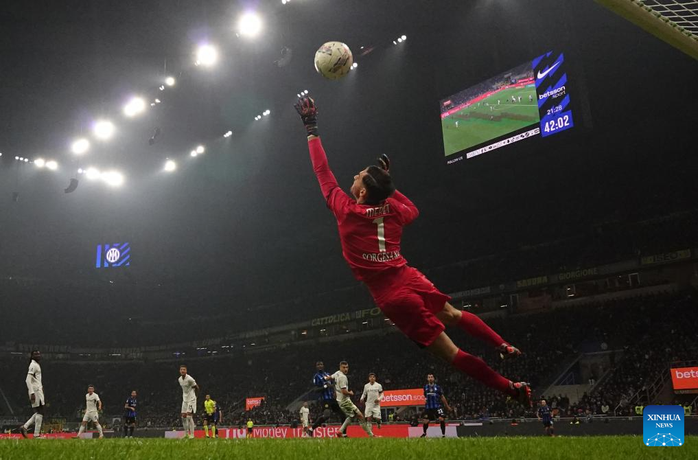 Napoli's goalkeeper Alex Meret fails to save Inter Milan's Hakan Calhanoglu's goal during a Serie A football match between Inter Milan and Napoli in Milan, Italy, Nov. 10, 2024. (Photo by Alberto Lingria/Xinhua)