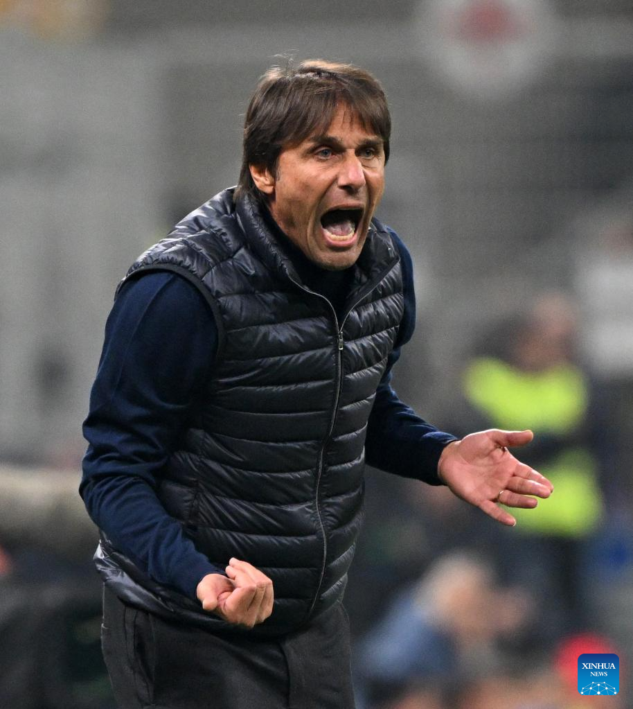 Napoli's head coach Antonio Conte gestures during a Serie A football match between Inter Milan and Napoli in Milan, Italy, Nov. 10, 2024. (Photo by Alberto Lingria/Xinhua)