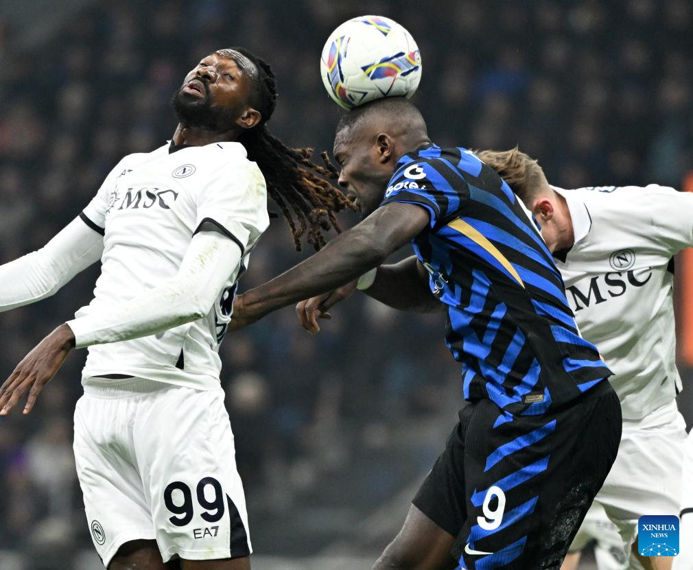 Inter Milan's Lautaro Martinez (L) vies with Napoli's Alessandro Buongiorno during a Serie A football match between Inter Milan and Napoli in Milan, Italy, Nov. 10, 2024. (Photo by Alberto Lingria/Xinhua)
