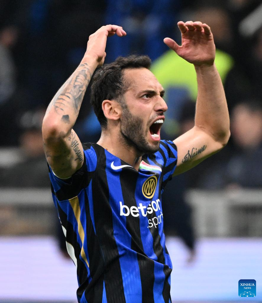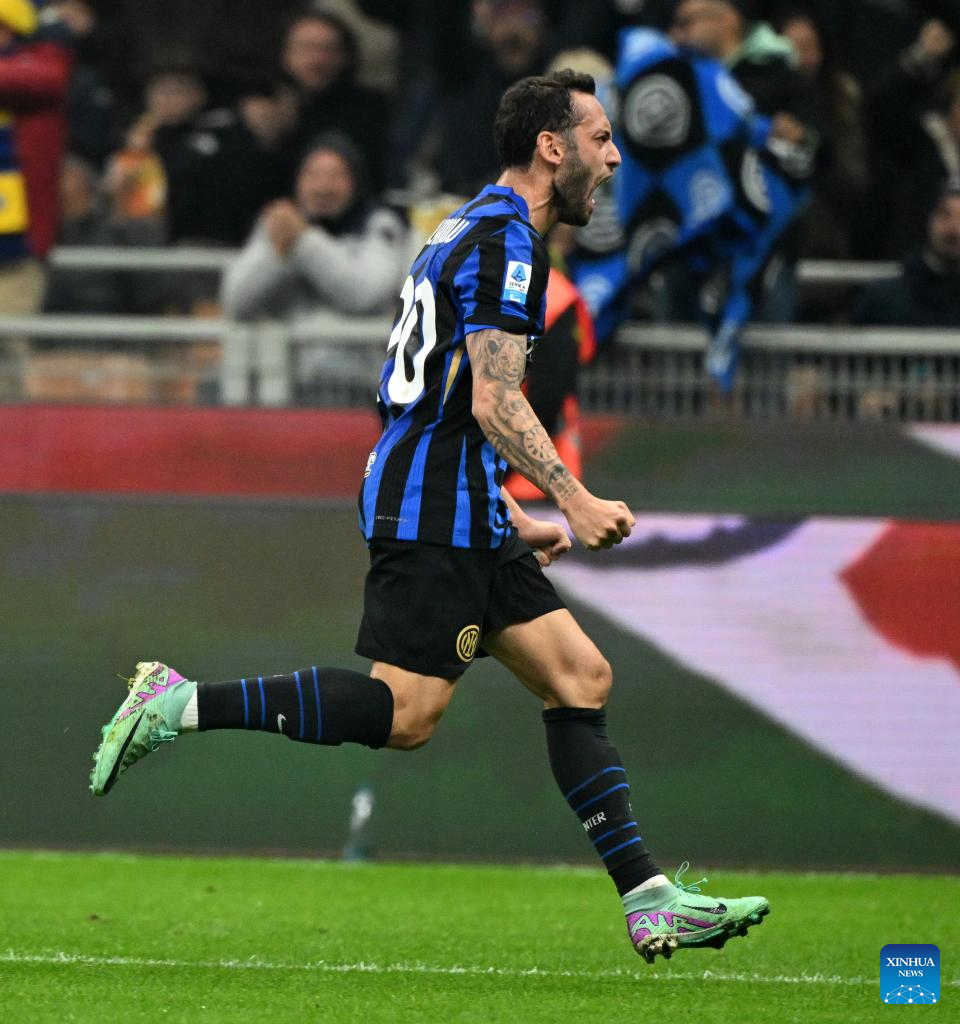 Inter Milan's Hakan Calhanoglu celebrates his goal during a Serie A football match between Inter Milan and Napoli in Milan, Italy, Nov. 10, 2024. (Photo by Alberto Lingria/Xinhua)